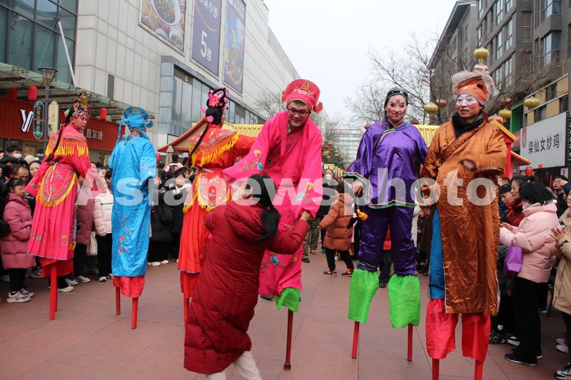 2025年2月2日农历乙巳年春节正月初五,正在陕西省西安市民乐园步行街表演非遗高跷的演员主动邀请观众一起随着欢快的鼓点节奏互动同乐。