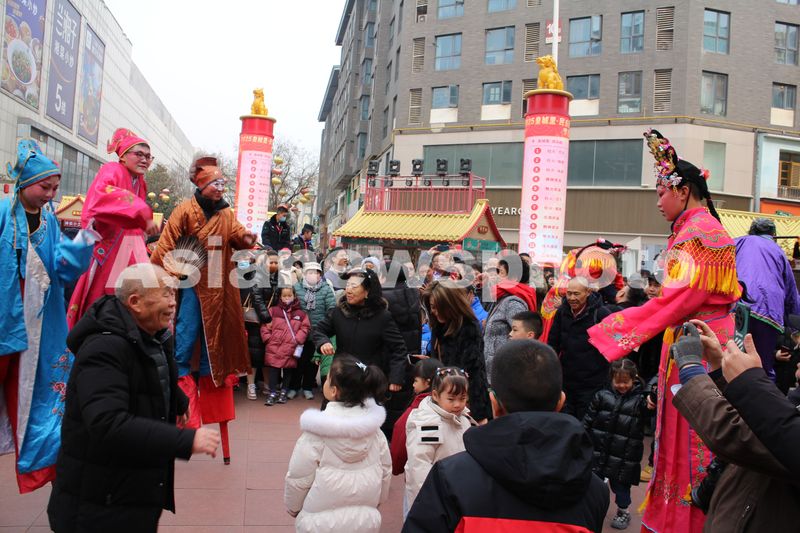 2025年2月2日农历乙巳年春节正月初五,正在陕西省西安市民乐园步行街表演非遗高跷的演员主动邀请观众一起随着欢快的鼓点节奏互动同乐。