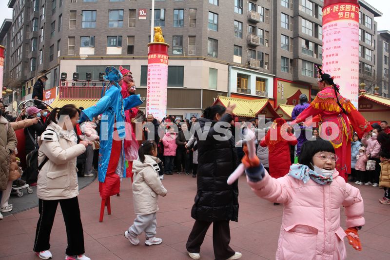 2025年2月2日农历乙巳年春节正月初五,正在陕西省西安市民乐园步行街表演非遗高跷的演员主动邀请观众一起随着欢快的鼓点节奏互动同乐。