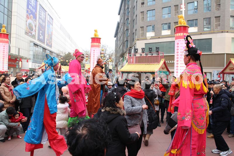 2025年2月2日农历乙巳年春节正月初五,正在陕西省西安市民乐园步行街表演非遗高跷的演员主动邀请观众一起随着欢快的鼓点节奏互动同乐。