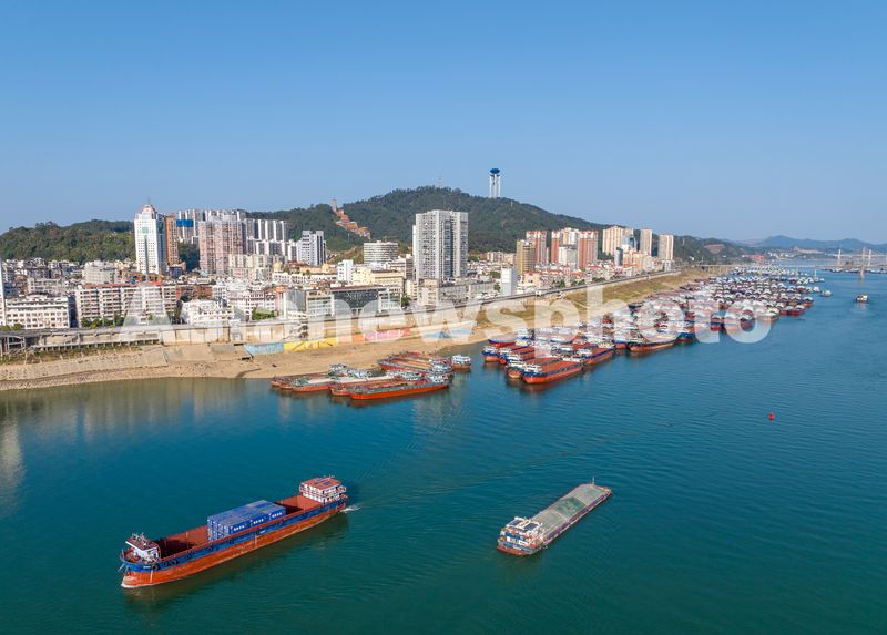 图片说明:2025年2月4日,珠江上游西江广西梧州市万秀区段水域,货船在航道上有序航行。
