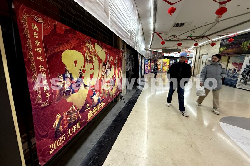 图片说明:2025年1月30日,北京丰台区一家电影院内,观众从《哪吒之魔童闹海》电影海报前经过。