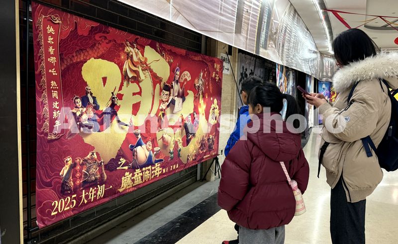 图片说明:2025年1月30日,北京丰台区一家电影院内,观众在《哪吒之魔童闹海》电影海报前驻足观看。