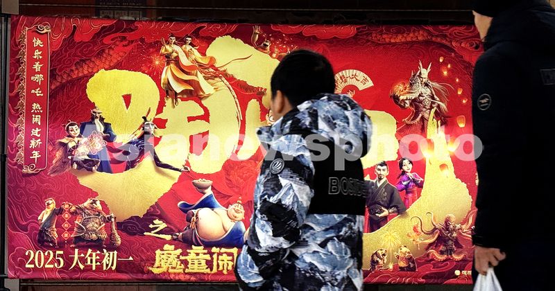 图片说明:2025年1月30日,北京丰台区一家电影院内,观众在《哪吒之魔童闹海》电影海报前驻足观看。