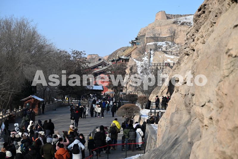 图片说明:2025年1月31日,游客在山西省大同市云冈石窟景区游览观光。
