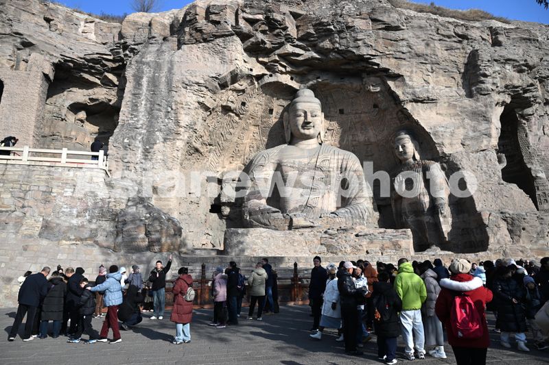图片说明:2025年1月31日,游客在山西省大同市云冈石窟景区游览观光。