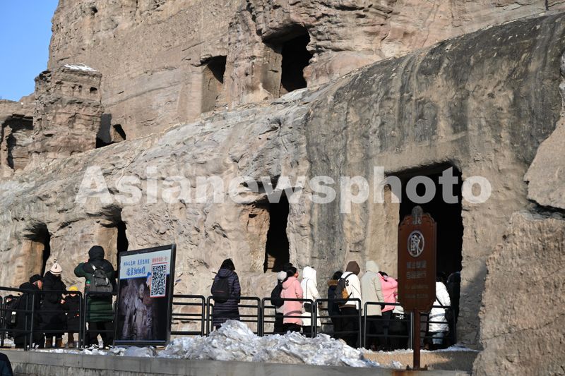 图片说明:2025年1月31日,游客在山西省大同市云冈石窟景区游览观光。