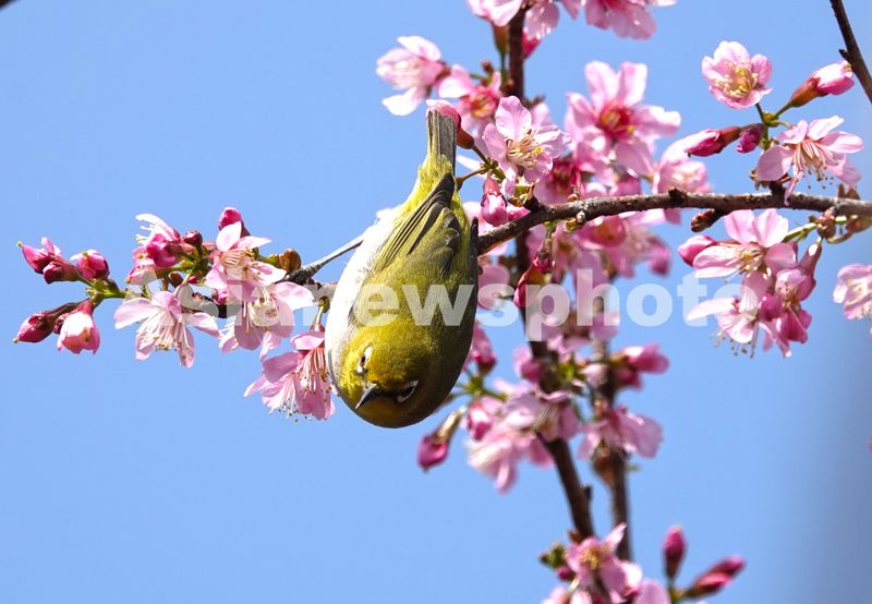图片说明:2月4日,在广西南宁市青秀山景区樱花园,一只小鸟跃在樱花的枝条上啄食花蜜。