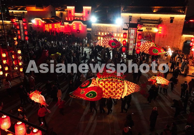 2025年2月6日,非遗民俗“汪满田鱼灯”在安徽省黄山市徽州区呈坎古村巡游。