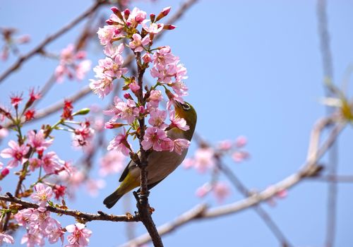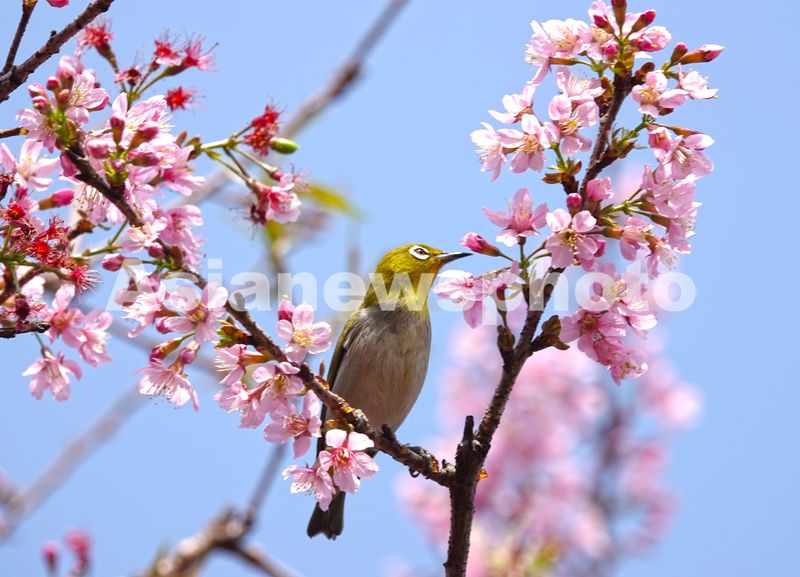 图片说明:2月4日,在广西南宁市青秀山景区樱花园,一只小鸟跃在樱花的枝条上啄食花蜜。
