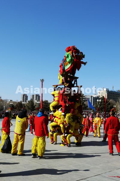 2025年2月9日,甘州区乌江镇安镇村社火队表演省级非遗项目高凳舞狮。