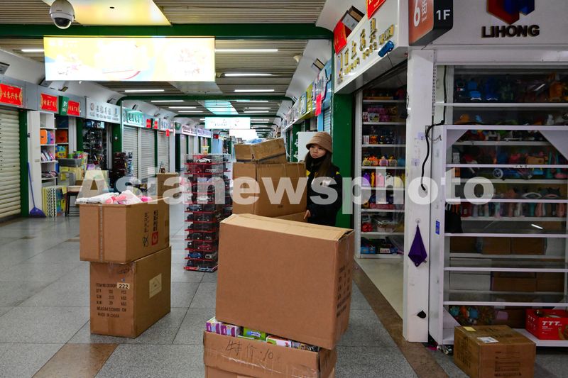 2025年2月9日,浙江金华,义乌国际商贸城蛇年开市首日,商户布置铺面上新货,喜迎国内外客商。