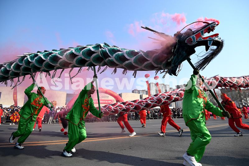 图片说明:2月10日,在河北省邯郸市峰峰矿区玉皇阁路,表演者在进行舞龙表演。
