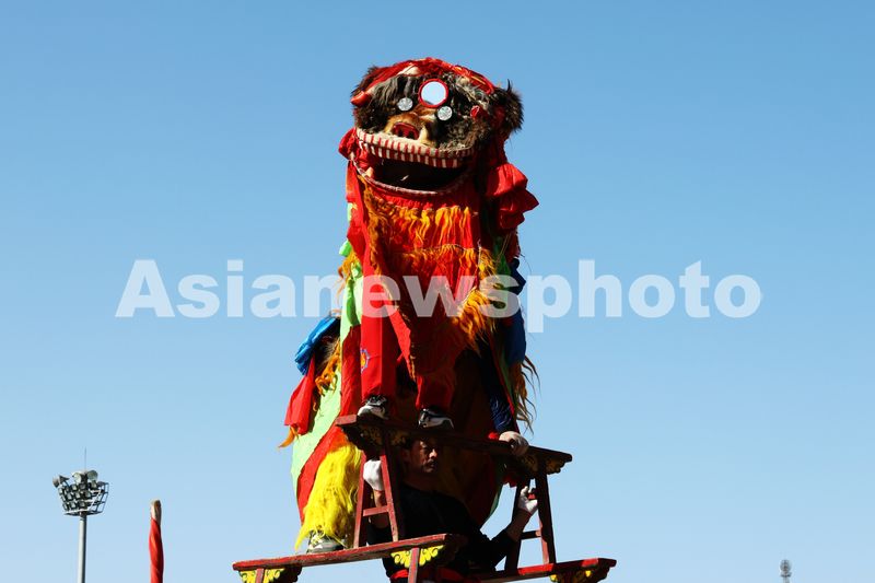 2025年2月9日,甘州区乌江镇安镇村社火队表演省级非遗项目高凳舞狮。