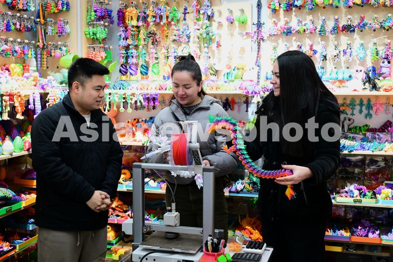 2025年2月9日,浙江金华,义乌国际商贸城蛇年开市首日,哥伦比亚外商与商户(图左)在洽谈采购3D打印新材料玩具。