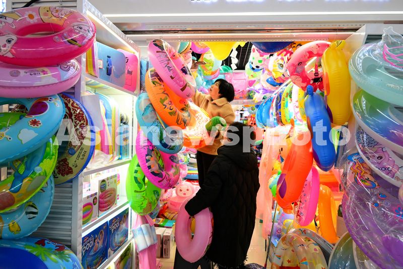 2025年2月9日,浙江金华,义乌国际商贸城蛇年开市首日,商户布置铺面上新货,喜迎国内外客商。