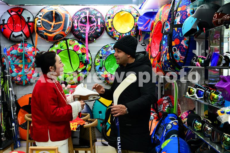 2025年2月9日,浙江金华,义乌国际商贸城蛇年开市首日,阿拉伯外商(图右)与商户在洽谈冰雪运动用品。