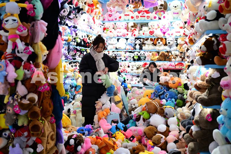 2025年2月9日,浙江金华,义乌国际商贸城蛇年开市首日,商户布置铺面上新货,喜迎国内外客商。