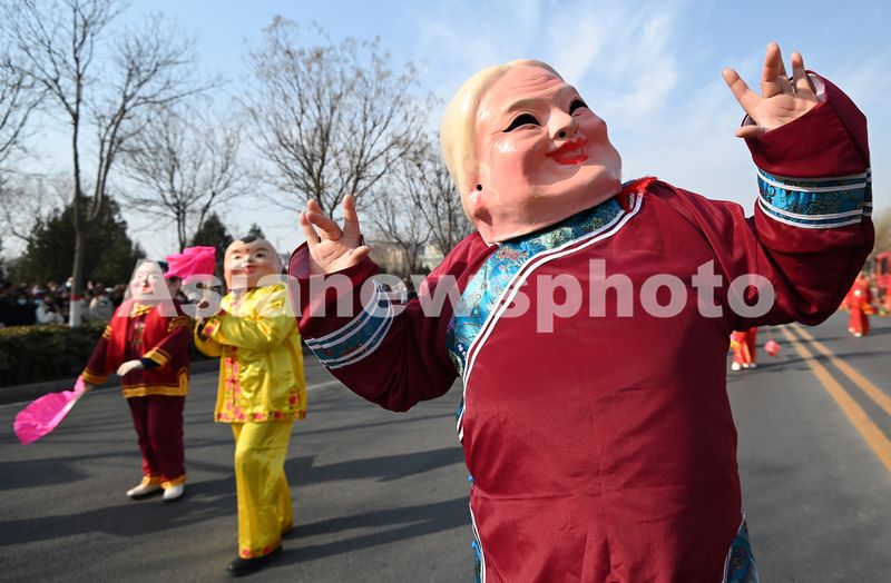 图片说明:2月10日,在河北省邯郸市峰峰矿区玉皇阁路,表演者在进行社火表演。