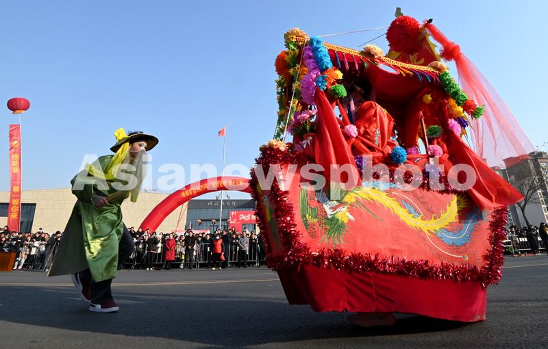 图片说明:2月10日,在河北省邯郸市峰峰矿区玉皇阁路,表演者在表演跑旱船。