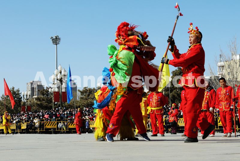 2025年2月9日,甘州区乌江镇安镇村社火队表演省级非遗项目高凳舞狮。