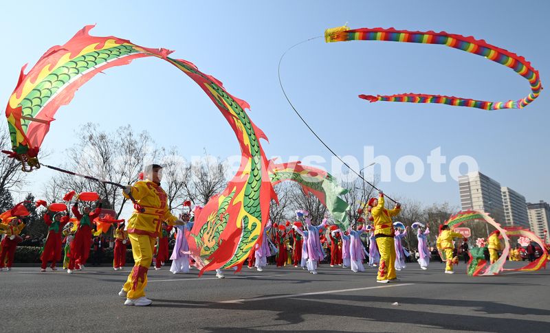 图片说明:2月10日,在河北省邯郸市峰峰矿区玉皇阁路,表演者在进行社火表演。