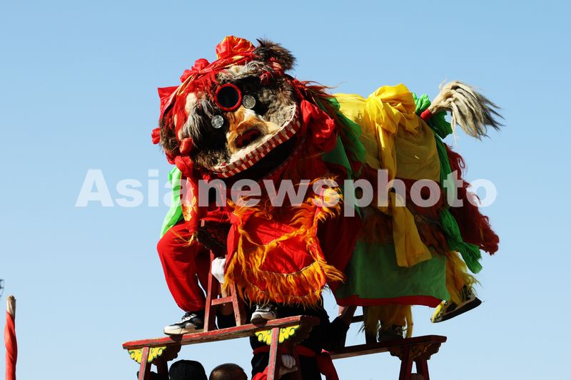 2025年2月9日,甘州区乌江镇安镇村社火队表演省级非遗项目高凳舞狮。