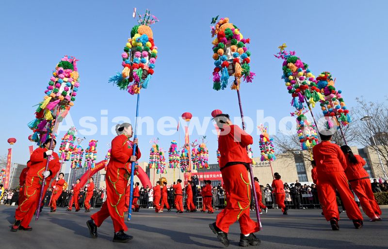 图片说明:2月10日,在河北省邯郸市峰峰矿区玉皇阁路,表演者在表演苇子灯阵。