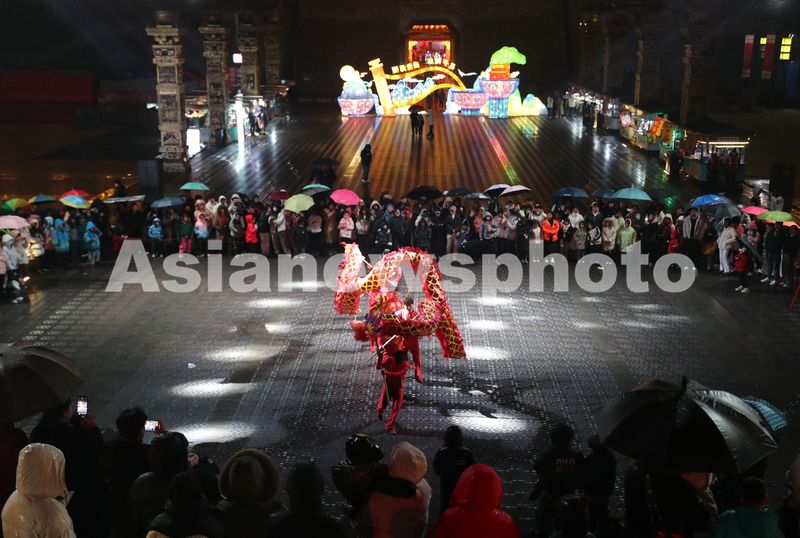 图片说明:2025年2月11日晚,民间艺人在山东省临沂市郯城县郯国古城进行舞龙表演。