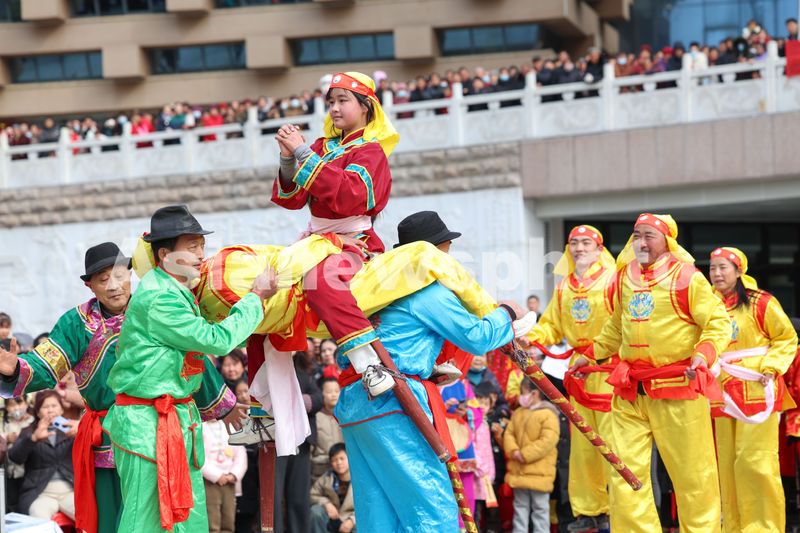 2025年2月12日,在湖北省襄阳市南漳县元宵节民俗展演活动中,当地群众表演高跷花鼓。