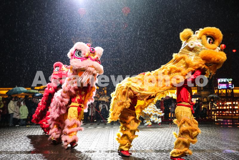 图片说明:2025年2月11日晚,民间艺人在山东省临沂市郯城县郯国古城进行舞狮表演。