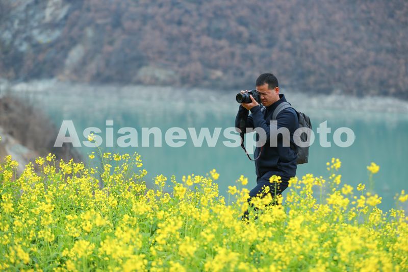 图片说明:2025年2月11日,甘肃省陇南市文县玉垒乡玉垒坪村的油菜花绽放,游客在赏花游玩。