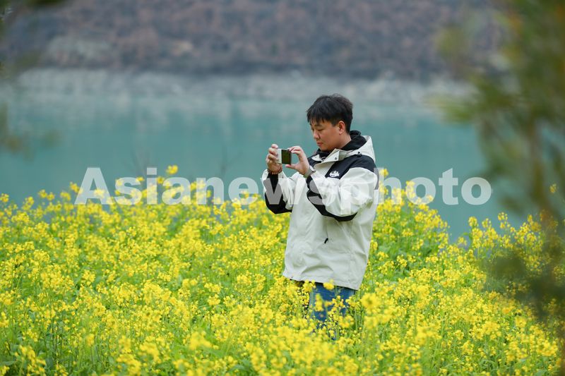 图片说明:2025年2月11日,甘肃省陇南市文县玉垒乡玉垒坪村的油菜花绽放,游客在赏花游玩。