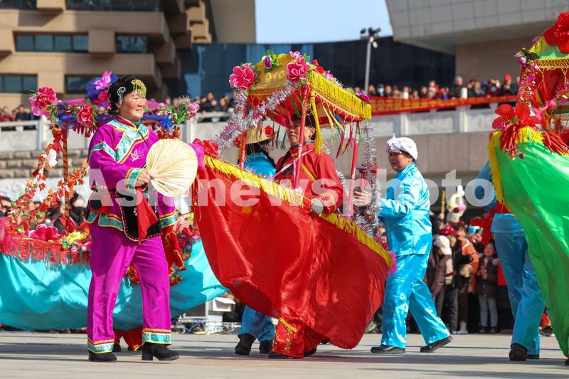 2025年2月12日,在湖北省襄阳市南漳县元宵节民俗展演活动中,当地群众表演采莲船。