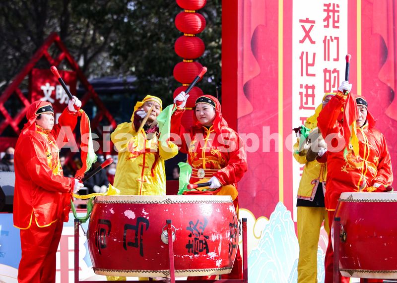 图片说明:2月12日,在河南省焦作市龙源湖公园,艺人在非遗精品展演中表演《司马懿得胜鼓》。