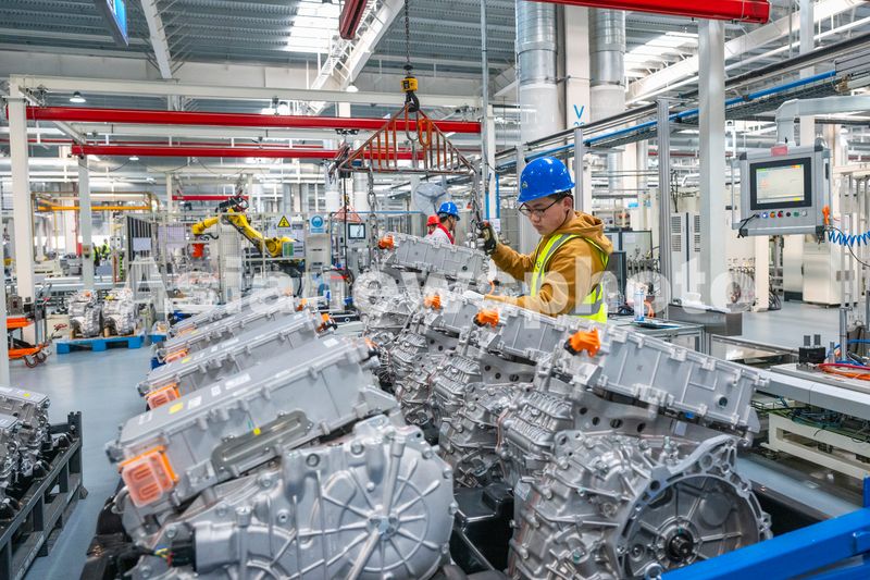 图片说明:2025年2月13日,在安徽省芜湖市繁昌经济开发区,工人在芜湖埃科动力系统奇瑞C-DM超级动力智能生产线上组装生产8AT自动变速箱。