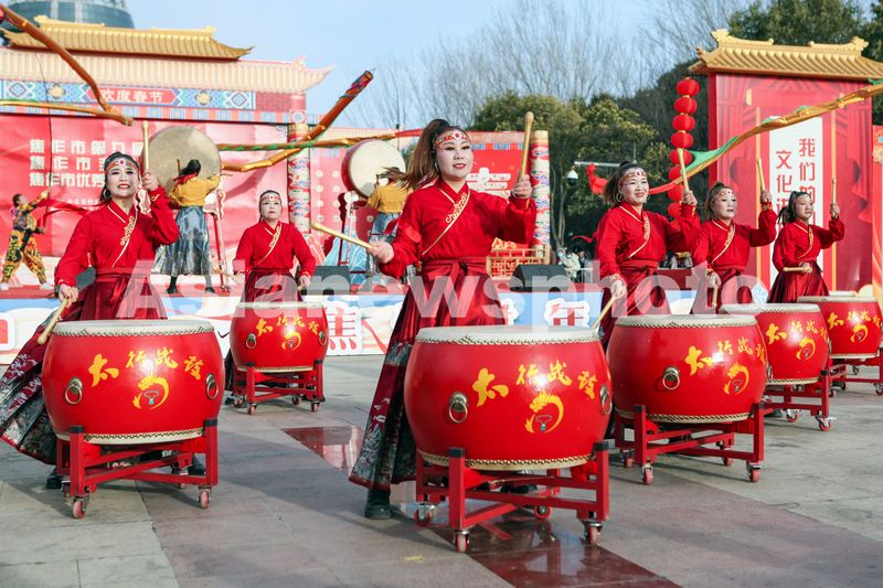 图片说明:2月12日,在河南省焦作市龙源湖公园,博爱县耀博文艺中心的艺人们在非遗精品展演中表演太行战鼓。