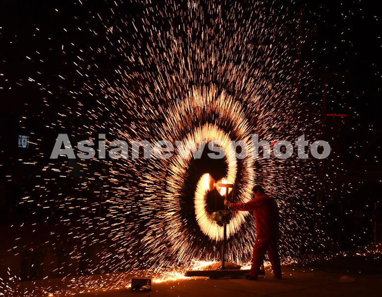 2025年2月11日晚,民间艺人在山西省运城市稷山县社区服务中心原家庄社区表演打铁花。