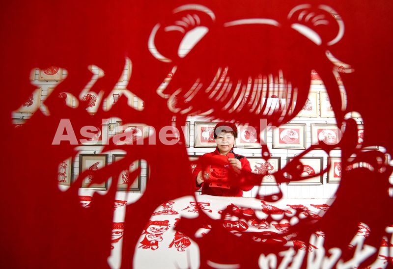 图片说明:2月13日,剪纸艺人冯石萍在创作“哪吒”剪纸作品。