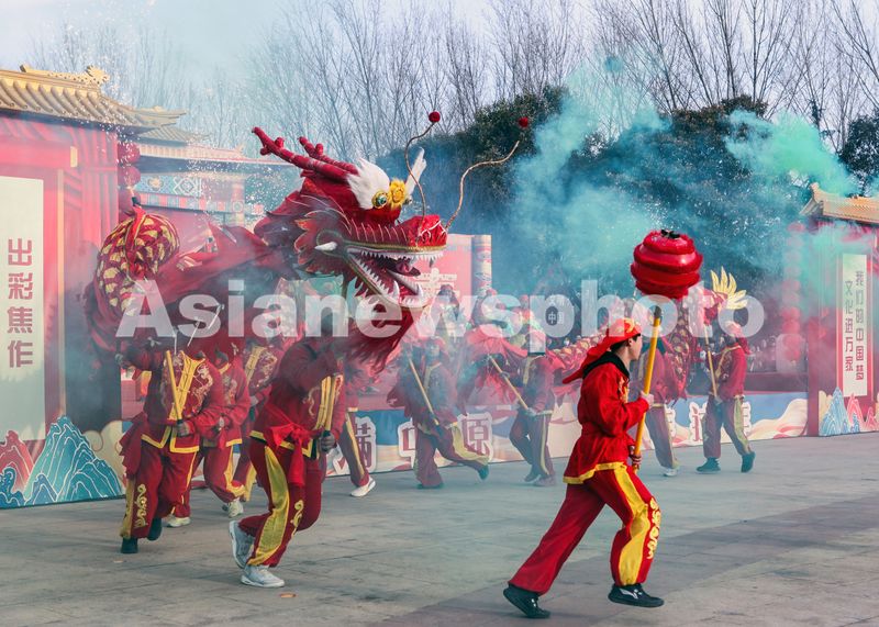 图片说明:2月12日下午,在河南省焦作市龙源湖公园,艺人在非遗精品展演中表演舞龙。