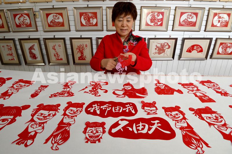图片说明:2月13日,剪纸艺人冯石萍在创作“哪吒”剪纸作品。