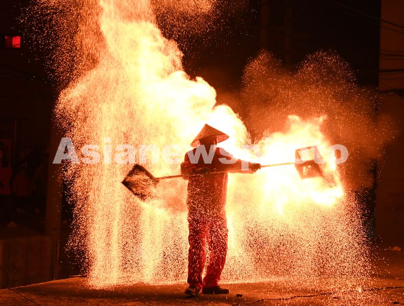 2025年2月11日晚,民间艺人在山西省运城市稷山县社区服务中心原家庄社区表演火壶。