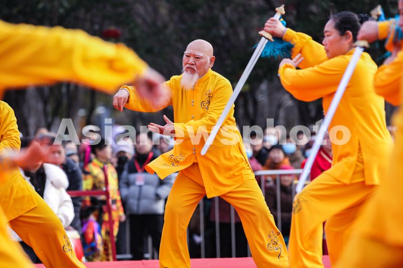 图片说明:2月12日,在河南省焦作市龙源湖公园,艺人在非遗精品展演中表演太极拳。