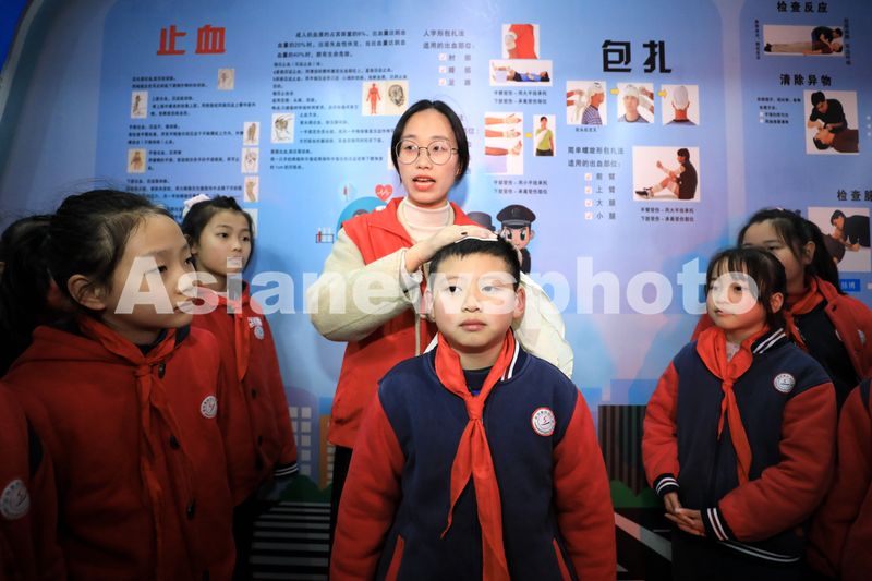 图片说明:2025年2月14日,浙江省湖州市长兴县吕山乡应急(安全)宣传教育体验馆,志愿者给吕山小学学生们教授一些简单的紧急救护技能。
