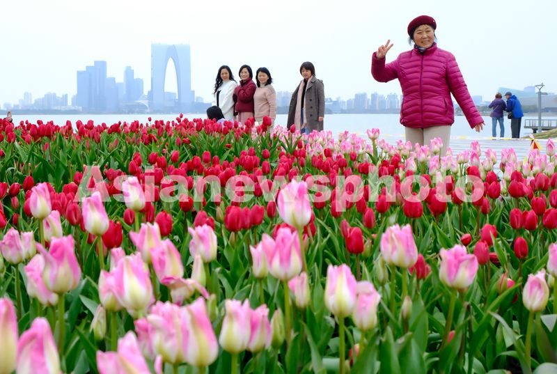 图片说明:2025年2月14日,几名游人在郁金香绽放的苏州市金鸡湖畔赏景拍照。