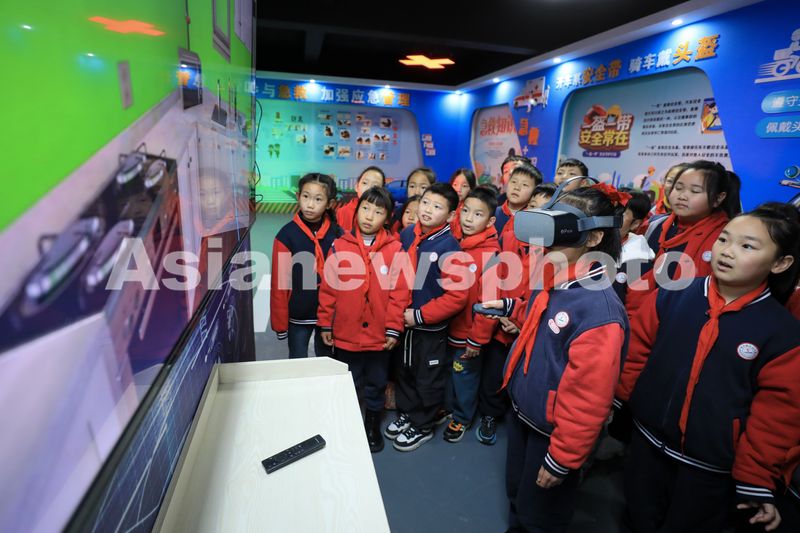 图片说明:2025年2月14日,浙江省湖州市长兴县吕山乡应急(安全)宣传教育体验馆,吕山小学学生体验VR灭火。