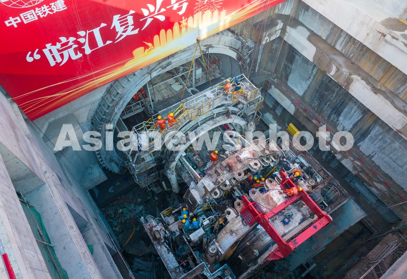 2025年2月16日,在安徽省芜湖市龙湾长江隧道,中铁十四局工作人员在对皖江复兴号盾构机进行拆除调离作业。