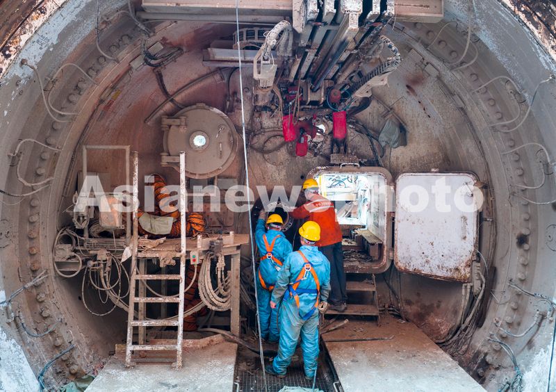 2025年2月16日,在安徽省芜湖市龙湾长江隧道,中铁十四局工作人员在对皖江复兴号盾构机进行拆除调离作业。