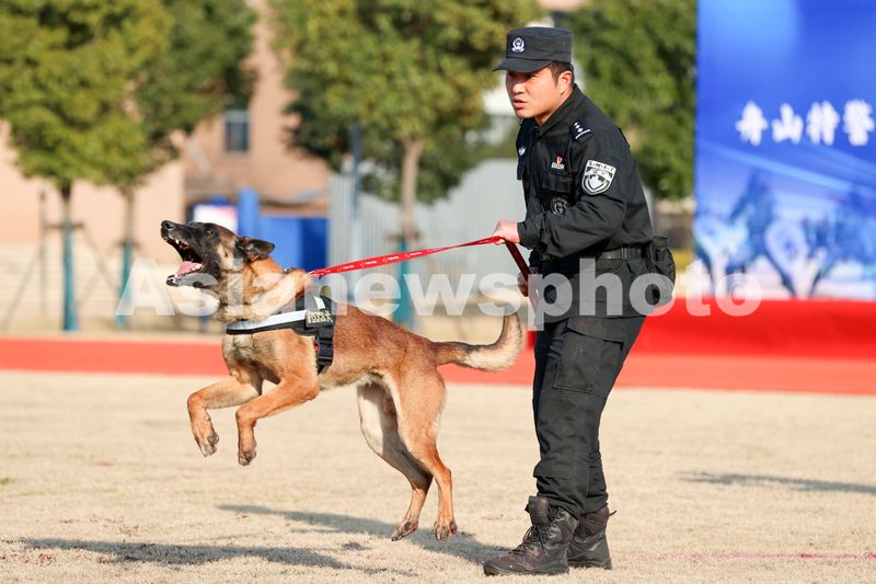 2025年2月18日,浙江省舟山市公安局巡特警支队组织队员开展警犬科目训练。