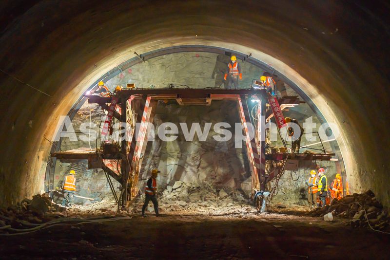 2025年12月18日,在湖北省宜昌市秭归县草池坪隧道中,工人正在架设隧道顶部钢筋。